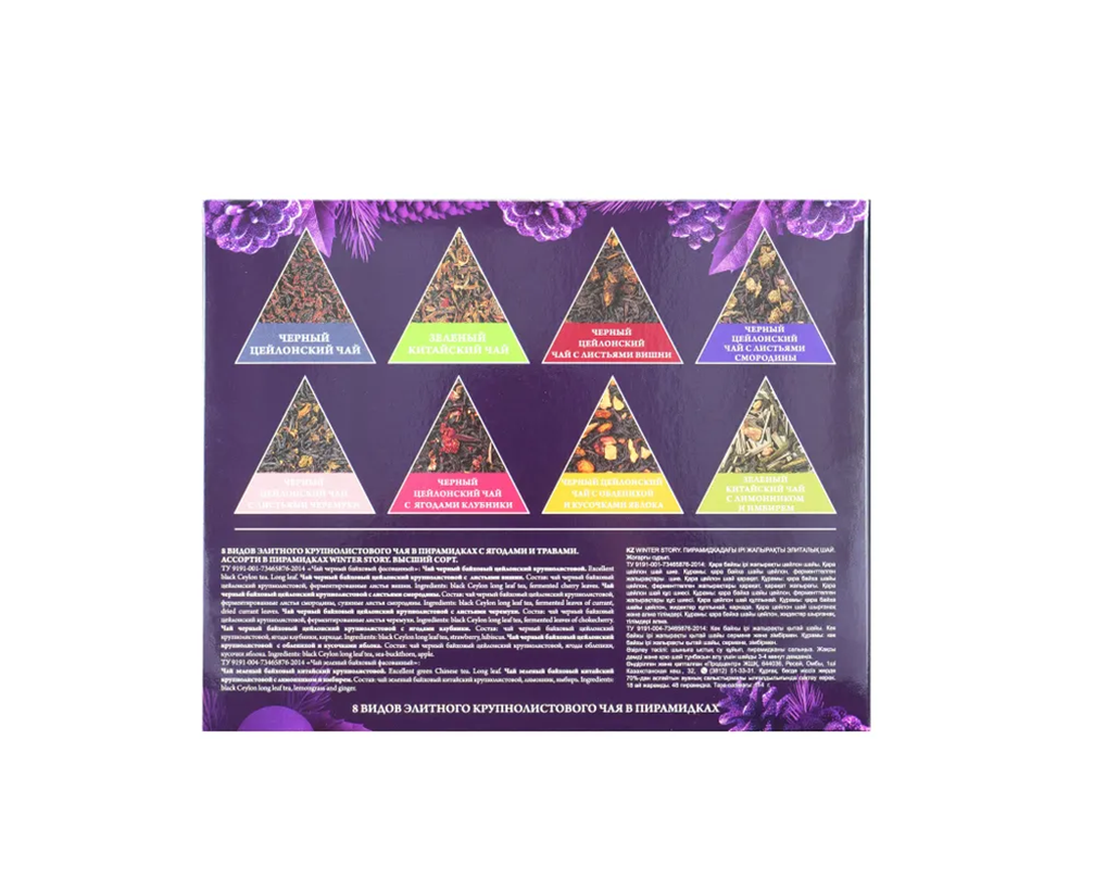 Чай новогодний подарочный набор включает в себя 48 пирамидок, каждая из которых содержит эксклюзивный выбор чая: черного и зеленого листового чая из самых изысканных сортов. Эти пирамидки чая удобны в использовании и обеспечивают легкое заваривание вашего любимого напитка.